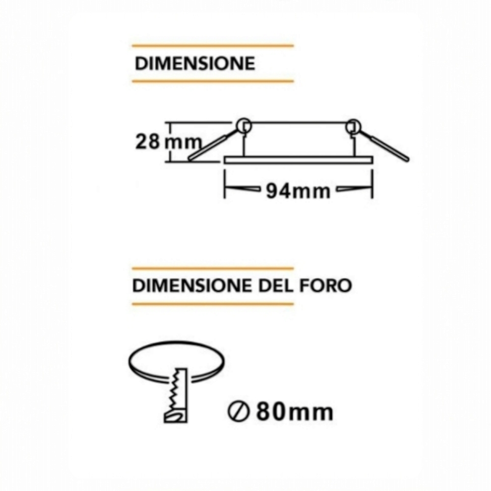 DIMENSIONI OTTIMALI PER INCASSO – Foro di montaggio Ø80mm, diametro esterno 94mm, profondità 28mm; perfetto per installazioni a filo soffitto.