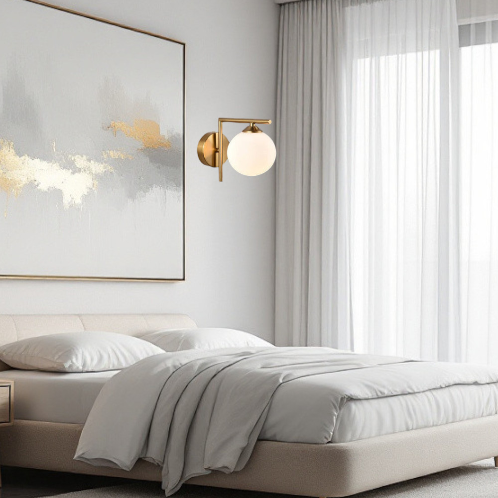 Questa elegante applique da parete combina design moderno e materiali di qualità per offrire un'illuminazione sofisticata e funzionale. Realizzata in metallo satinato oro, è dotata di un raffinato paralume a sfera in vetro opalino bianco, che diffonde la luce in modo uniforme, creando un'atmosfera accogliente.