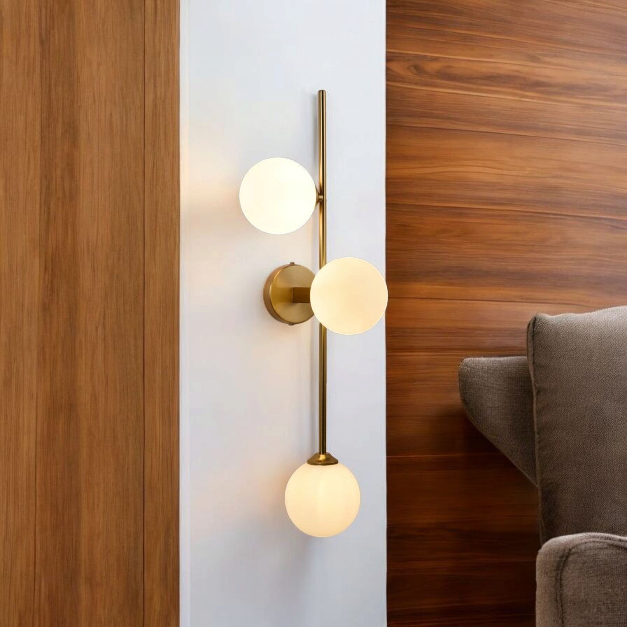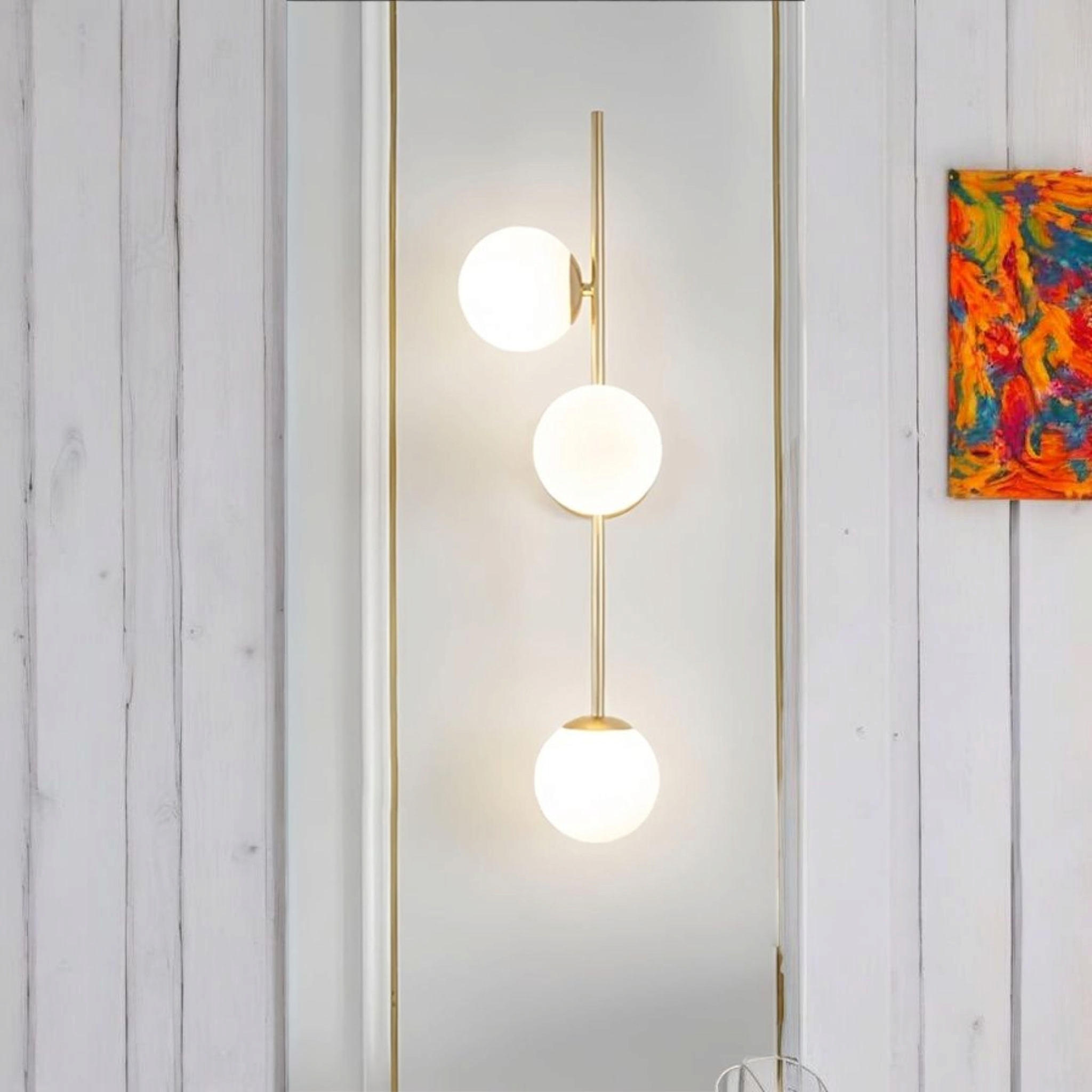 Design elegante e raffinato – Applique da parete con struttura in metallo dorato e tre sfere in vetro opalino, perfetta per creare un'illuminazione d'atmosfera in soggiorni, camere da letto, ingressi e corridoi.