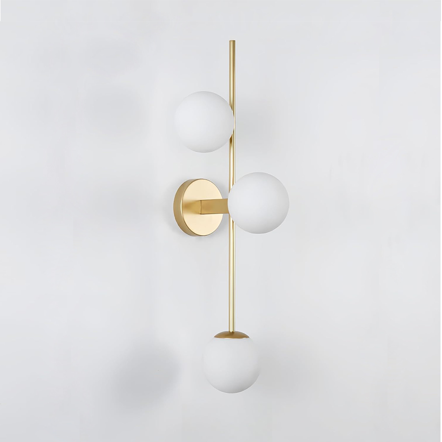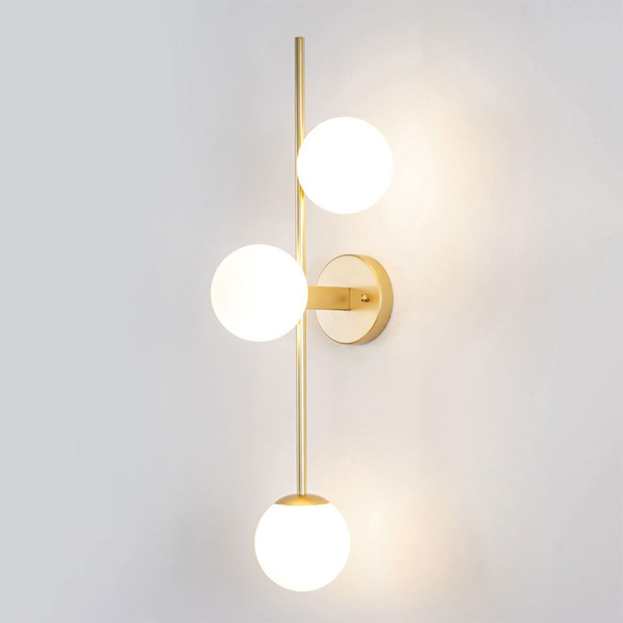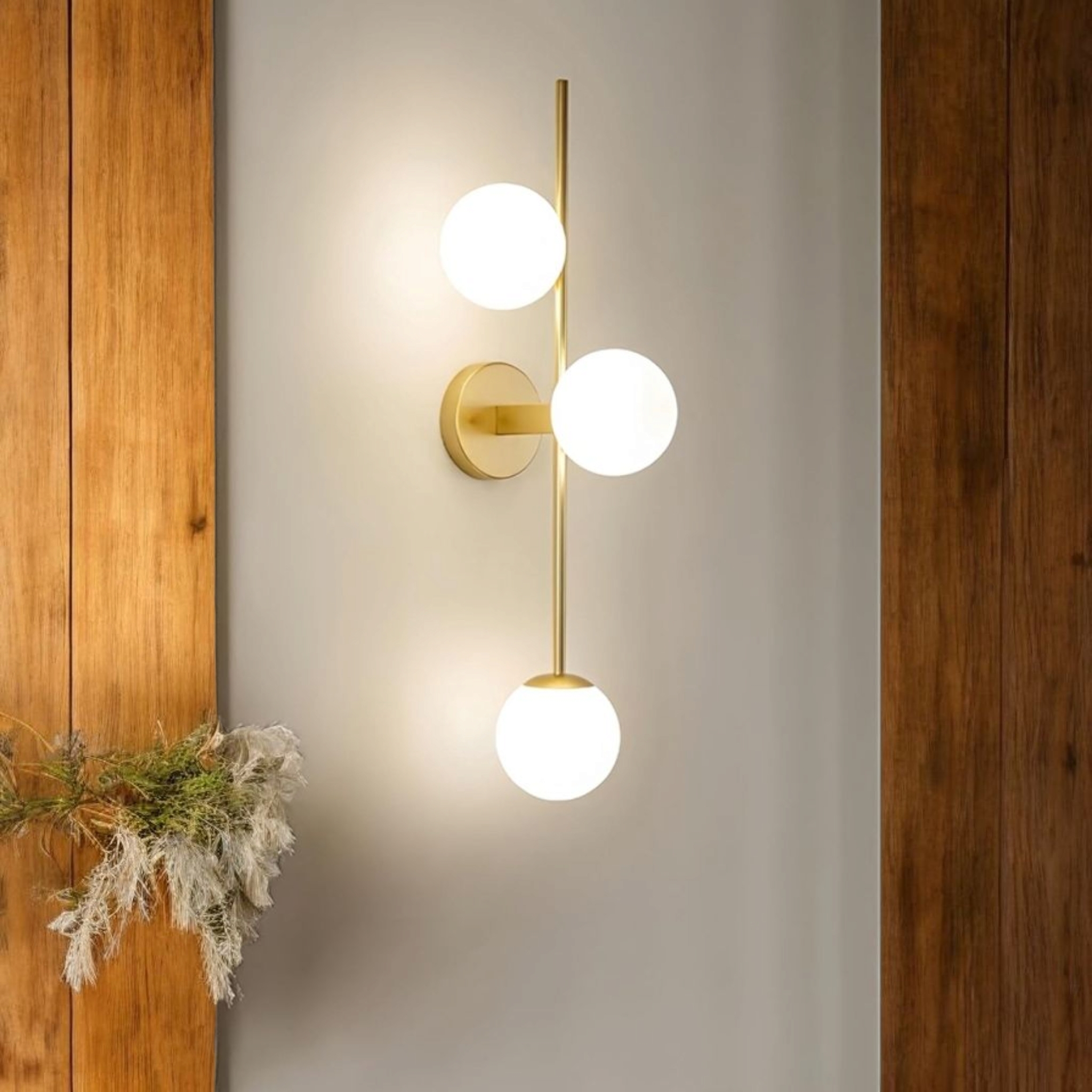 Design elegante e raffinato – Applique da parete con struttura in metallo dorato e tre sfere in vetro opalino, perfetta per creare un'illuminazione d'atmosfera in soggiorni, camere da letto, ingressi e corridoi.