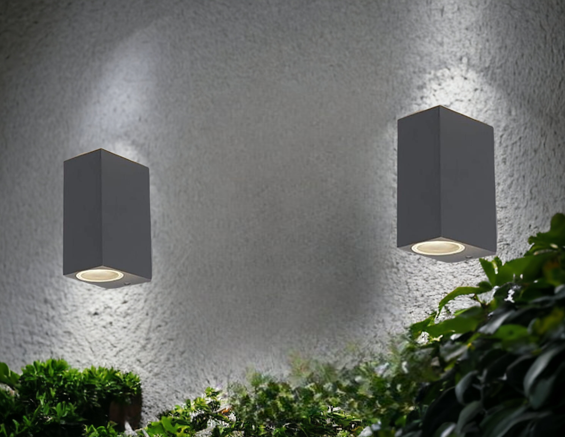 Applique grigio da esterno ip65 lampada a parete moderna doppia luce con attacco gu10 biemissione per giardini terrazze balconi