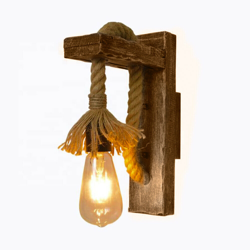 Applique lampada da parete in legno e corda di canapa E27 stile classico country