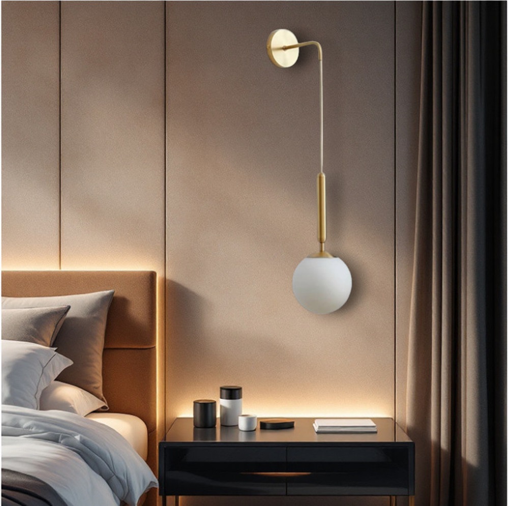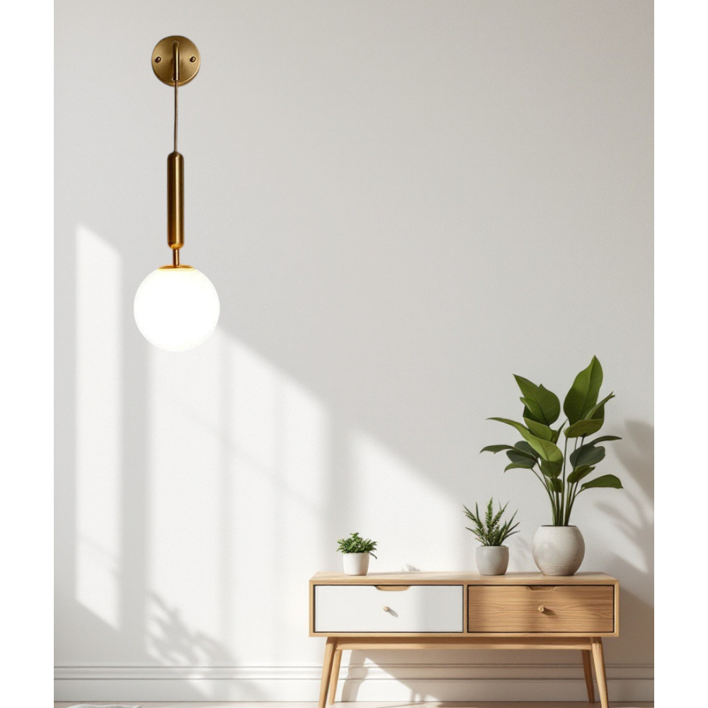 Aggiungi un tocco di eleganza e raffinatezza ai tuoi ambienti con questa applique da parete LED color oro, un perfetto equilibrio tra design minimalista e funzionalità. La struttura in metallo dorato si combina con una sfera opalina in acrilico da 15 cm, che diffonde una luce morbida e accogliente, perfetta per creare un’atmosfera rilassante.