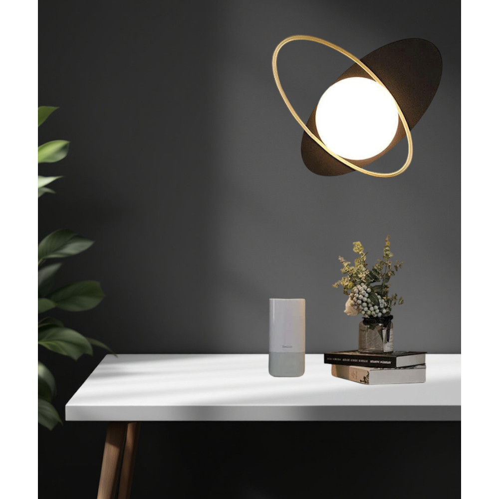 Design Moderno e Minimalista – Applique da parete con forme geometriche eleganti e materiali di alta qualità. La combinazione di metallo nero, anello dorato e sfera bianca crea un effetto decorativo raffinato.