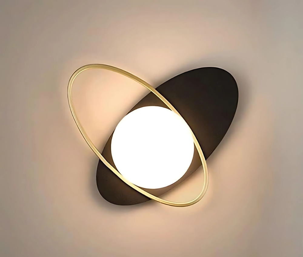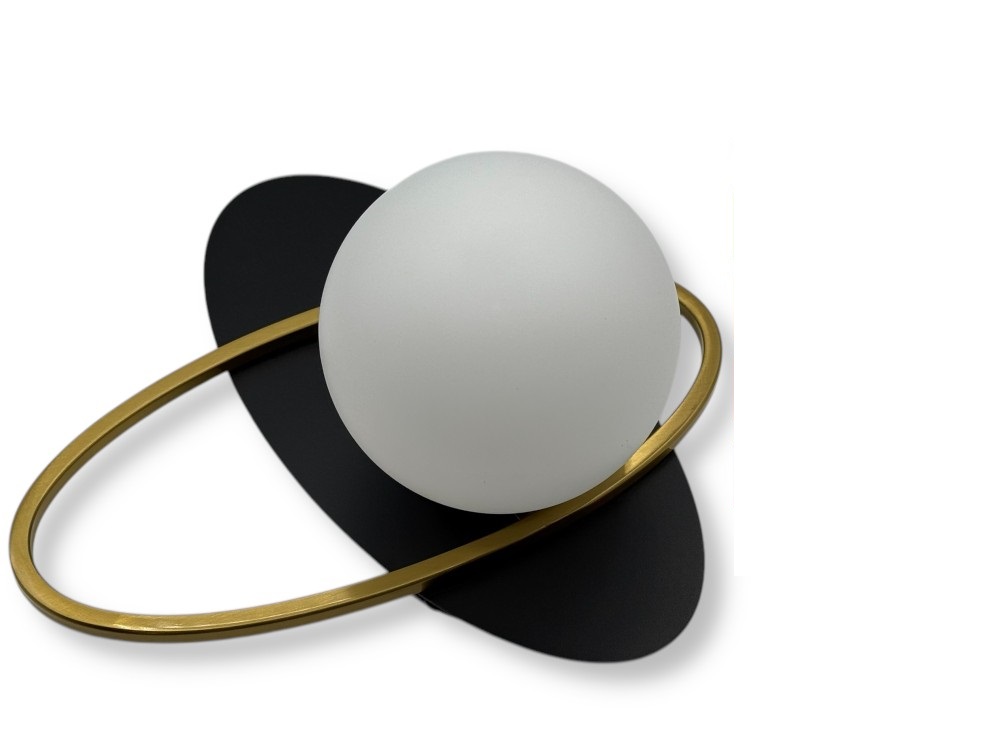 Design Moderno e Minimalista – Applique da parete con forme geometriche eleganti e materiali di alta qualità. La combinazione di metallo nero, anello dorato e sfera bianca crea un effetto decorativo raffinato.