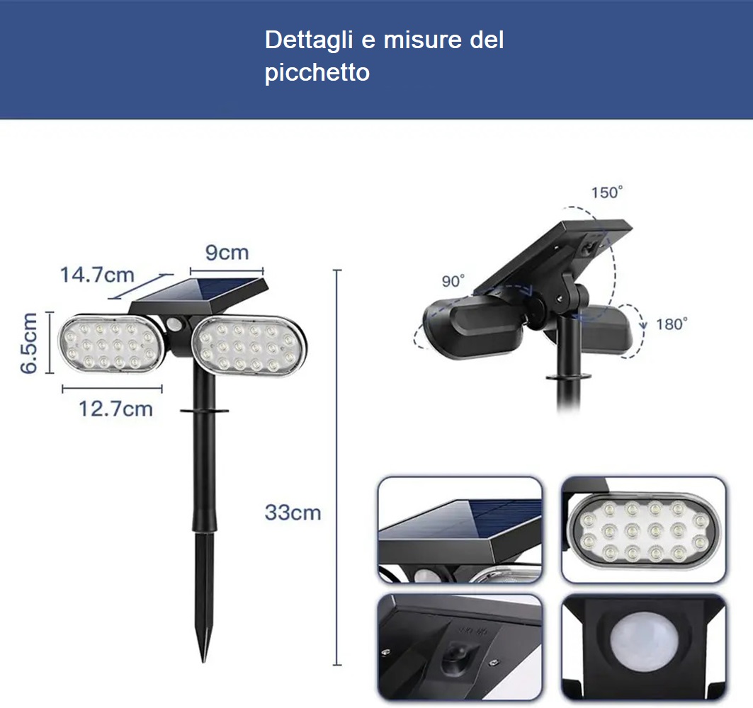 Il sensore crepuscolare assicura che il faretto si accenda automaticamente al tramonto, mentre il sensore di movimento attiva la luce quando rileva movimenti nell'area circostante, contribuendo così alla sicurezza del tuo giardino. Scegli tra due diverse modalità di intensità luminose per soddisfare le tue esigenze.