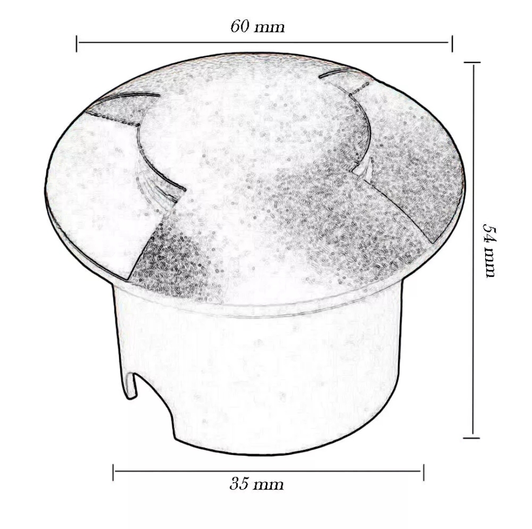 Installazione semplice e sicura: Dimensioni compatte (54x60 mm) e facile installazione direttamente a terra, con un foro di 35 mm. Si alimenta direttamente alla 240V, offrendo una soluzione pratica e sicura per l'illuminazione esterna.