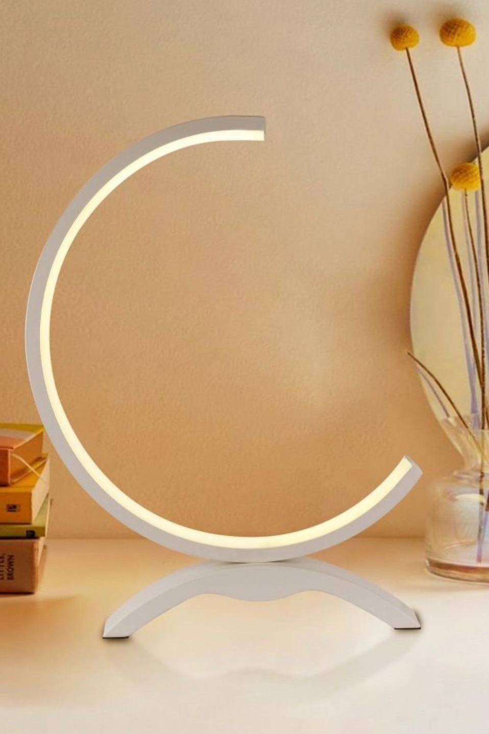 Lampada dal design moderno con forma di cerchio aperto mezzaluna. Particolarmente indicata per ambienti moderni da posizionare su scrivanie, mobiletti bassi o in camera da letto.