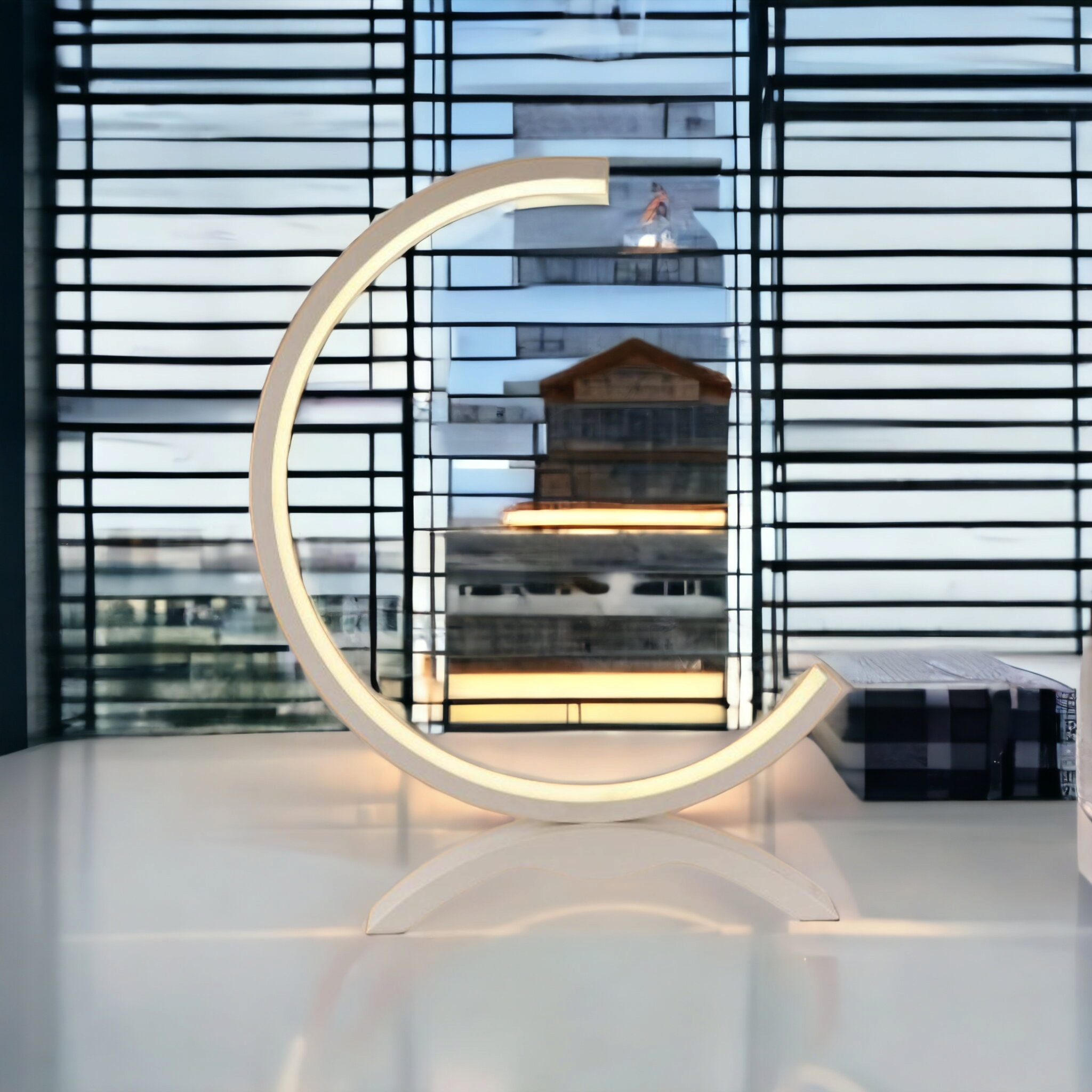 Lampada dal design moderno con forma di cerchio aperto mezzaluna. Particolarmente indicata per ambienti moderni da posizionare su scrivanie, mobiletti bassi o in camera da letto.