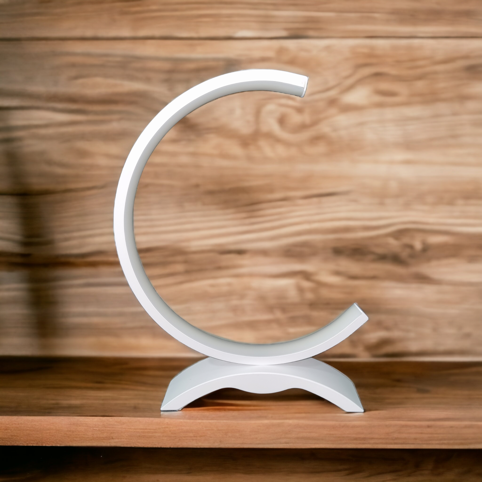 Lampada dal design moderno con forma di cerchio aperto mezzaluna. Particolarmente indicata per ambienti moderni da posizionare su scrivanie, mobiletti bassi o in camera da letto.