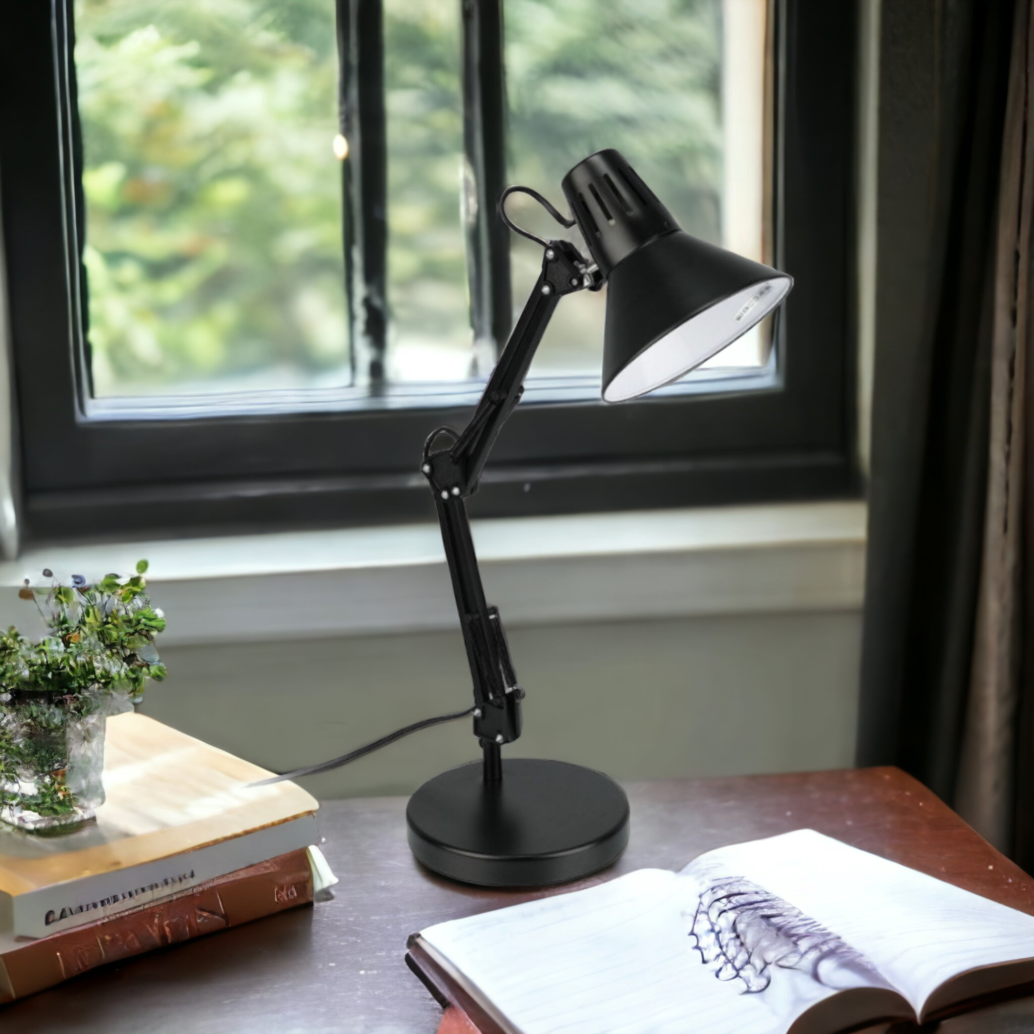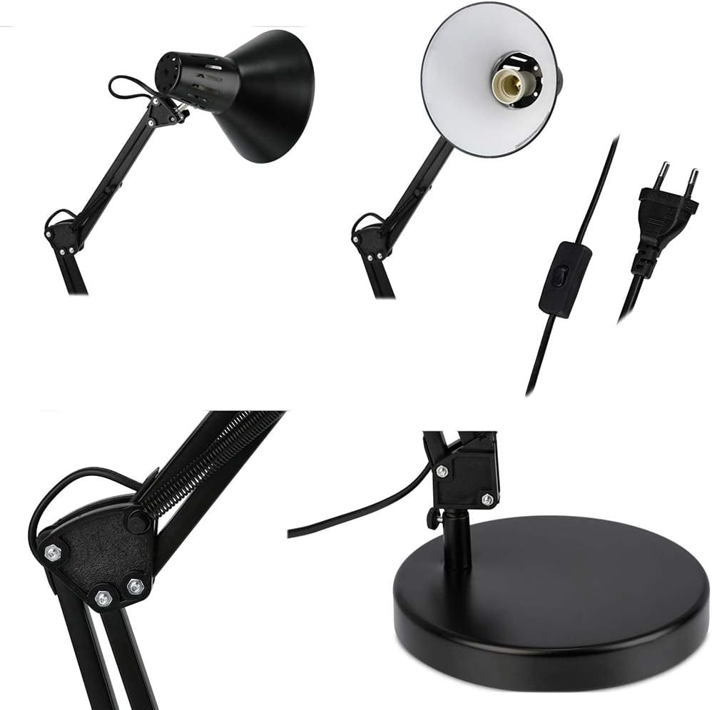 Lampada da Tavolo nera in Metallo con Braccio Pieghevole e Testa Girevole Attacco E27 Base Stabile Morsetto Incluso Ideale per Scrivania