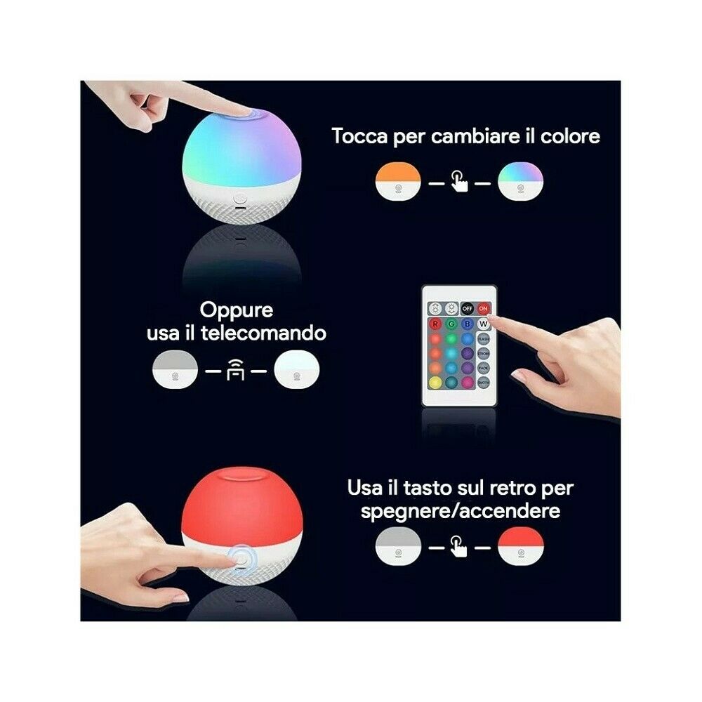 Lampada notturna LED da tavolo RGB con potenza di 1.8W e alimentazione DC5V. Lampada da tavolo di forma sferica realizzata in plastica opalina che dona un piacevole effetto porcellanato. La base è piatta e può essere appoggiata su qualsiasi superficie piana. La particolarità di questa lampada è quella di incorporare all'interno di un unico prodotto diverse forme di illuminazione. Riproduce una luce colorata con 10 livelli di luminosità, 16 colori e modalità di illuminazione (flash, rotazione, stroboscopio, dissolvenza) Grazie al telecomando in dotazione, è possibile accedere a diverse funzioni: - funzione ON/OFF; - controllo dell'intensità luminosa; - selezione della temperatura colore RGB (16 colori selezionabili); - diversi giochi di luce selezionabili Il telecomando è alimentato da una batteria a bottone (inclusa). Dimensioni: Ø 95 x 85 mm. Lunghezza cavo: 70cm.