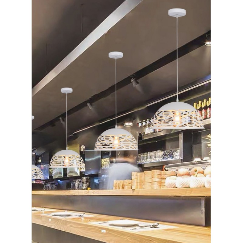 Lampadario a sospensione composto da un paralume traforato in metallo verniciato per un emissione di luce a 360°, dal design contemporaneo ideale per valorizzare ambienti di casa come cucina e corridoi. I suoi lineamenti semplici lo rendono un pendente adatto anche per spazi pubblici come negozi, ristoranti, pub e uffici. Portalampada per lampadine E27 (lampada non inclusa) Dimensioni: Lunghezza cavo totale 120 cm circa (regolabile in base alle proprie esigenze) Diametro base soffitto 12cm Diametro paralume 36 cm. Colore: Nero o bianco Alimentazione 230v L'offerta prevede l'acquisto di nr 1 lampadario, le foto dove vengono inllustrati più lampadari sono solo a scopo illustrativo