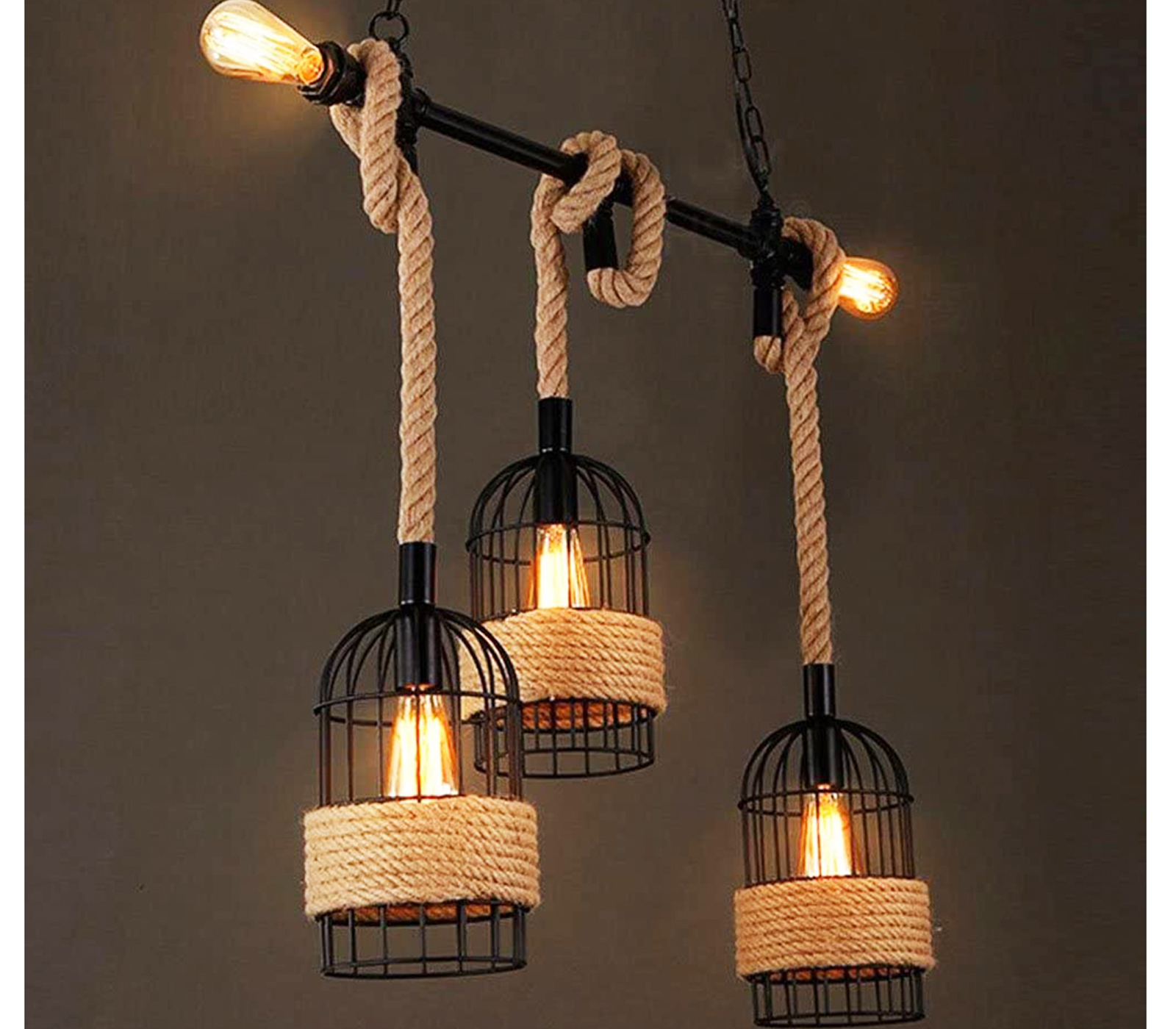 Il lampadario è realizzato in lega di metallo e corda di canapa. perfetto per arredare casa con originalità ma anche tavernette, bar, pub, ristoranti