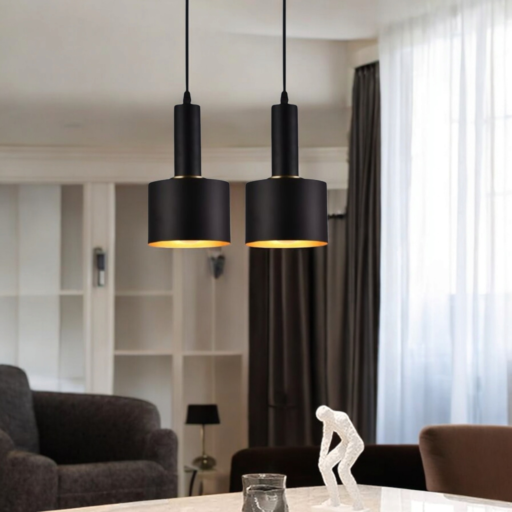 Design Elegante e Materiale Resistente: Lampada pendente in metallo nero con interno dorato, ideale per aggiungere un tocco di stile e durata a qualsiasi ambiente.