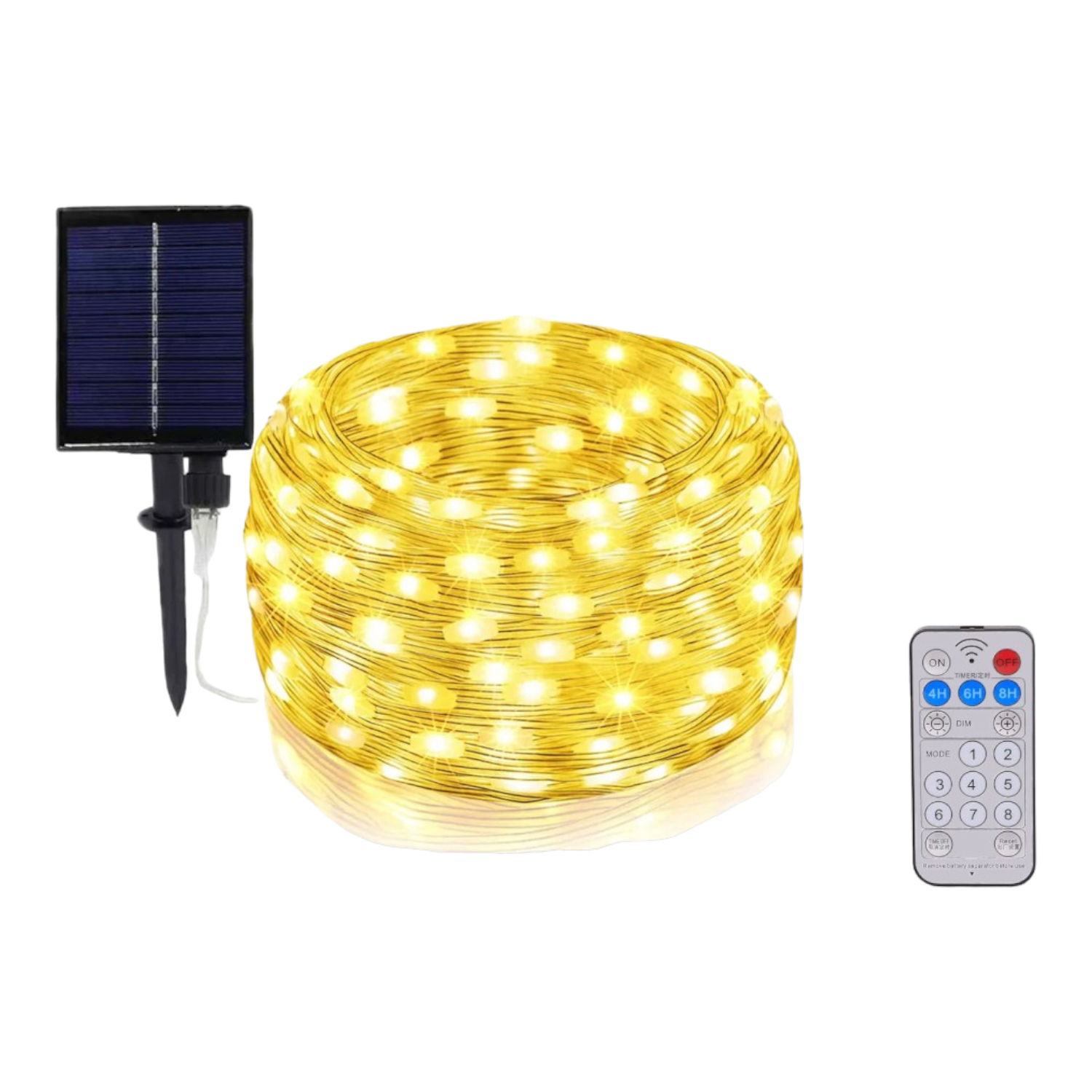 Trasforma il tuo spazio esterno in un luogo magico con la nostra Catena Luminosa Solare Esterna. Questa catena luminosa da 10 metri è dotata di 100 LED a luce calda che creano un'atmosfera natalizia perfetta. Che tu stia decorando il giardino, il patio, il balcone o la veranda, queste luci aggiungeranno un tocco di magia a qualsiasi ambiente, tutto l'anno. La nostra catena luminosa è alimentata sia dall'energia solare che dalla ricarica USB. Durante il giorno, il pannello solare integrato assorbe l'energia solare per alimentare le luci durante la notte. Inoltre, è possibile ricaricarle tramite USB per illuminare anche nelle serate nuvolose. Questo doppio metodo di alimentazione ti offre la massima flessibilità. Grazie al telecomando incluso, hai il controllo completo delle luci. Puoi accenderle e spegnerle, regolare la luminosità e impostare un timer di spegnimento a 4, 6 o 8 ore. Con diverse modalità di intermittenza tra cui scegliere, puoi personalizzare l'illuminazione in base all'atmosfera desiderata. La nostra catena luminosa è costruita per durare. Con una copertura in silicone che offre una protezione di grado IP65, queste luci sono resistenti alle intemperie e possono essere utilizzate sotto la pioggia. Puoi installarle a terra con il picchetto incluso o appenderle con il gancio dedicato. Con un fascio luminoso a 360°, queste luci creano un'atmosfera accogliente e magica che lascerà un'impressione indelebile.Le luci LED a luce calda a 3000K aggiungono calore e comfort all'ambiente, perfette per riunioni in giardino, serate romantiche o semplicemente per creare un'atmosfera festiva. Non limitare l'uso di queste luci solo al periodo natalizio. Grazie alla loro versatilità, possono essere utilizzate durante tutto l'anno per creare atmosfere diverse. Crea un'atmosfera festosa o un'illuminazione vivace quando desideri rilassarti all'aperto.