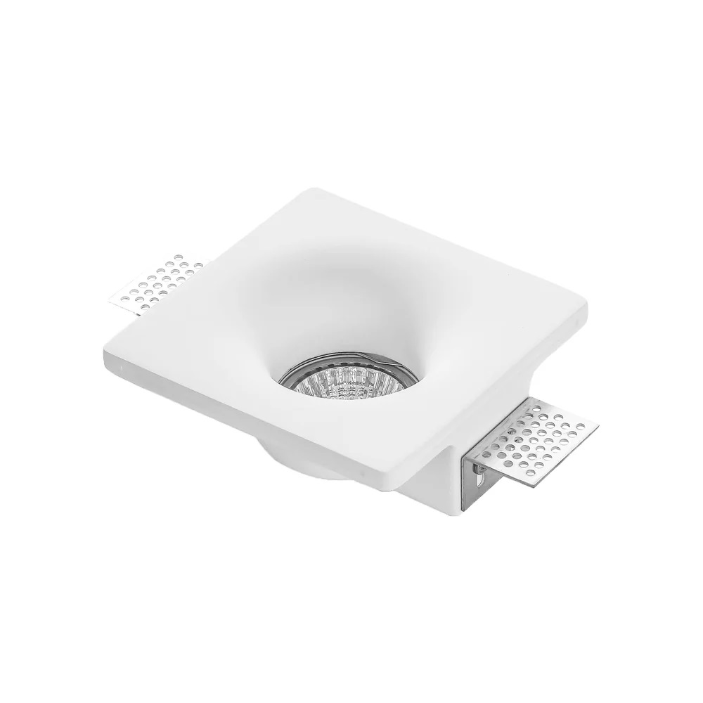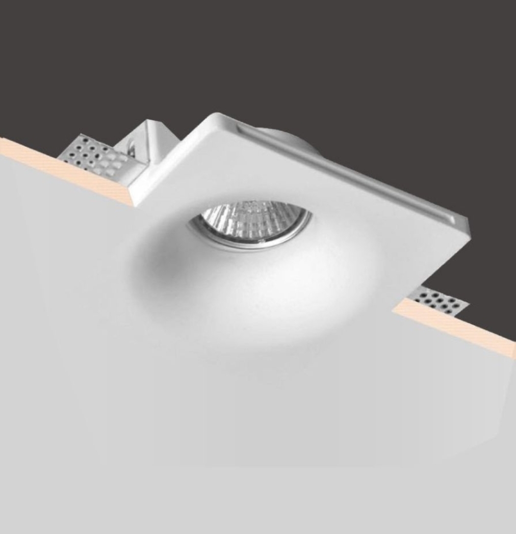 Portafaretto da incasso in gesso 120x120mm, foro 125x125mm, compatibile con faretti GU10, design a scomparsa
