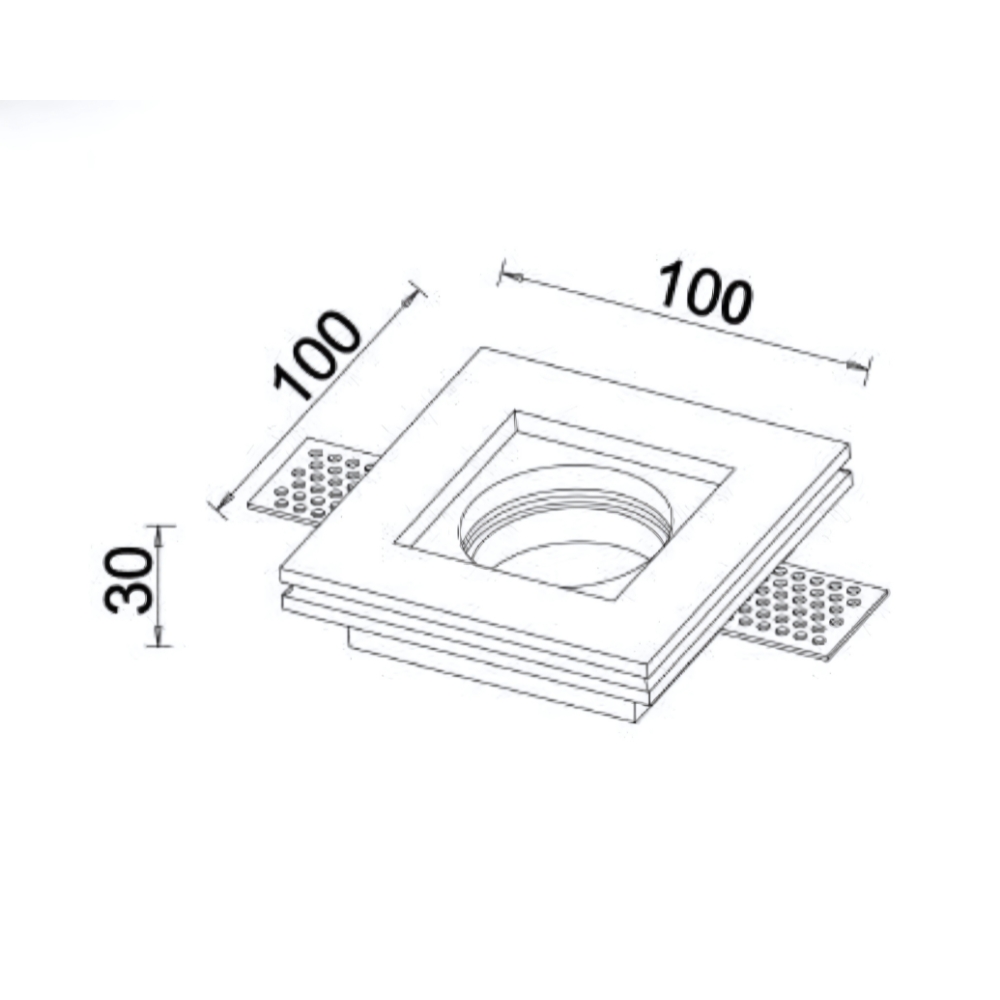 Realizzato in gesso verniciabile, questo supporto può essere rifinito con la stessa tinta del soffitto per un aspetto omogeneo. L'installazione è semplice grazie alle alette laterali in metallo, che garantiscono un fissaggio stabile nel cartongesso. Con dimensioni di 100x100x30mm e un foro d’incasso di 105x105mm, si adatta a diverse configurazioni di illuminazione in casa, uffici o negozi.