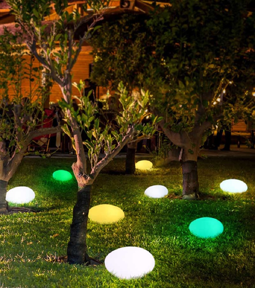 Sfera luminosa decorativa con pannello solare a forma tonda / ovale, dotata di led integrati Rgb + W. Grazie al sensore crepuscolare integrato, la lampada si accenderà automaticamente al calar del sole .