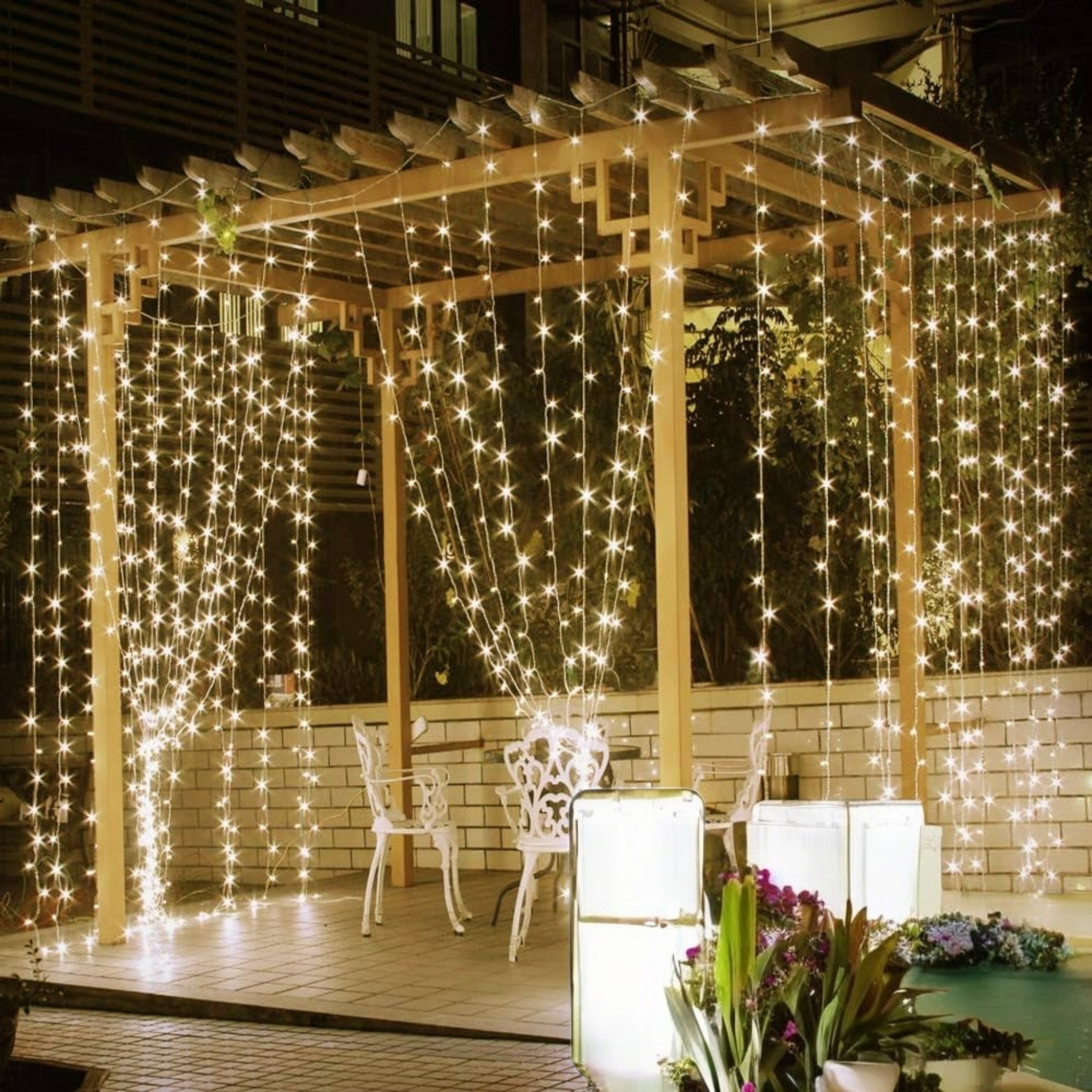 300 LED a Luce Calda e Cavo Trasparente: Illumina gazebi, patii e balconi con una luce accogliente e un effetto tenda elegante, grazie al cavo trasparente che si mimetizza facilmente.