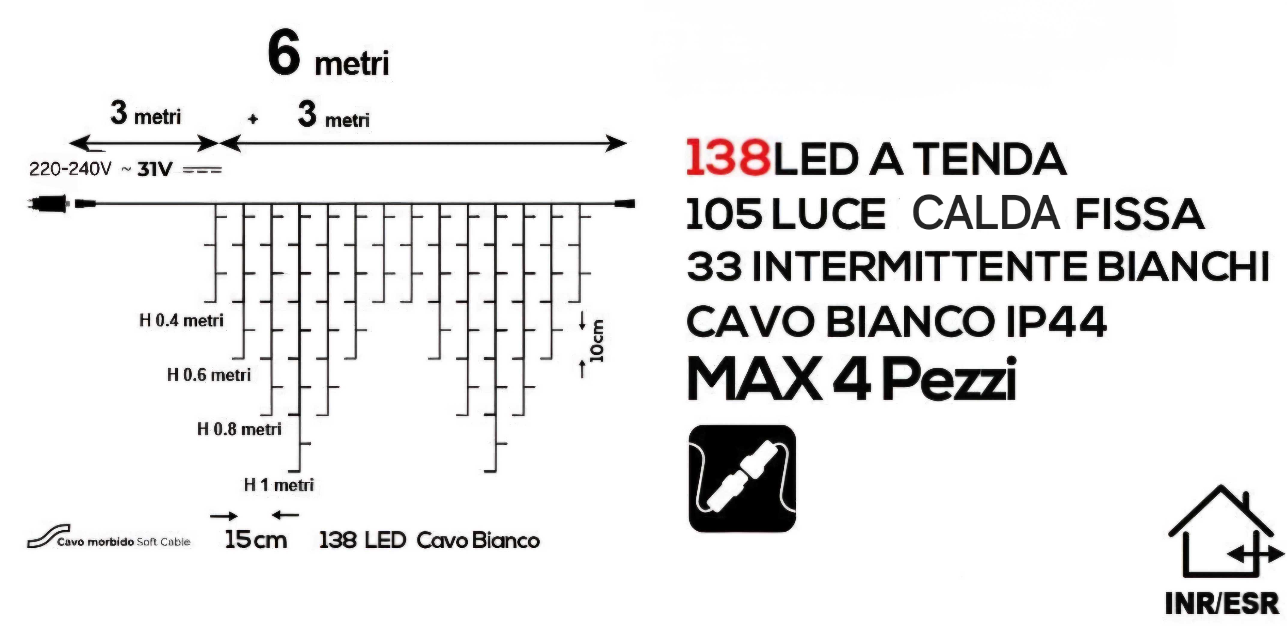 138 luci LED: Suddivise in 105 LED fissi bianco caldo e 33 LED flash a luce fredda per un effetto scintillante. Dimensioni: 3x1 metri di area illuminata + 3 metri di cavo di alimentazione per una facile installazione. Estensibile: Possibilità di collegare fino a 4 tende per un’illuminazione più ampia. Uso interno ed esterno: Grado di protezione IP44, ideale per decorazioni esterne durante le feste natalizie. Alimentatore incluso: Trasformatore a 31V incluso, da installare in un luogo coperto o in apposite casse di derivazione per esterni. Cavo bianco: Si integra perfettamente con qualsiasi tipo di decorazione, sia chiara che scura. Crea la perfetta atmosfera natalizia con questa tenda luminosa versatile e sicura, adatta per tutte le tue esigenze decorative.