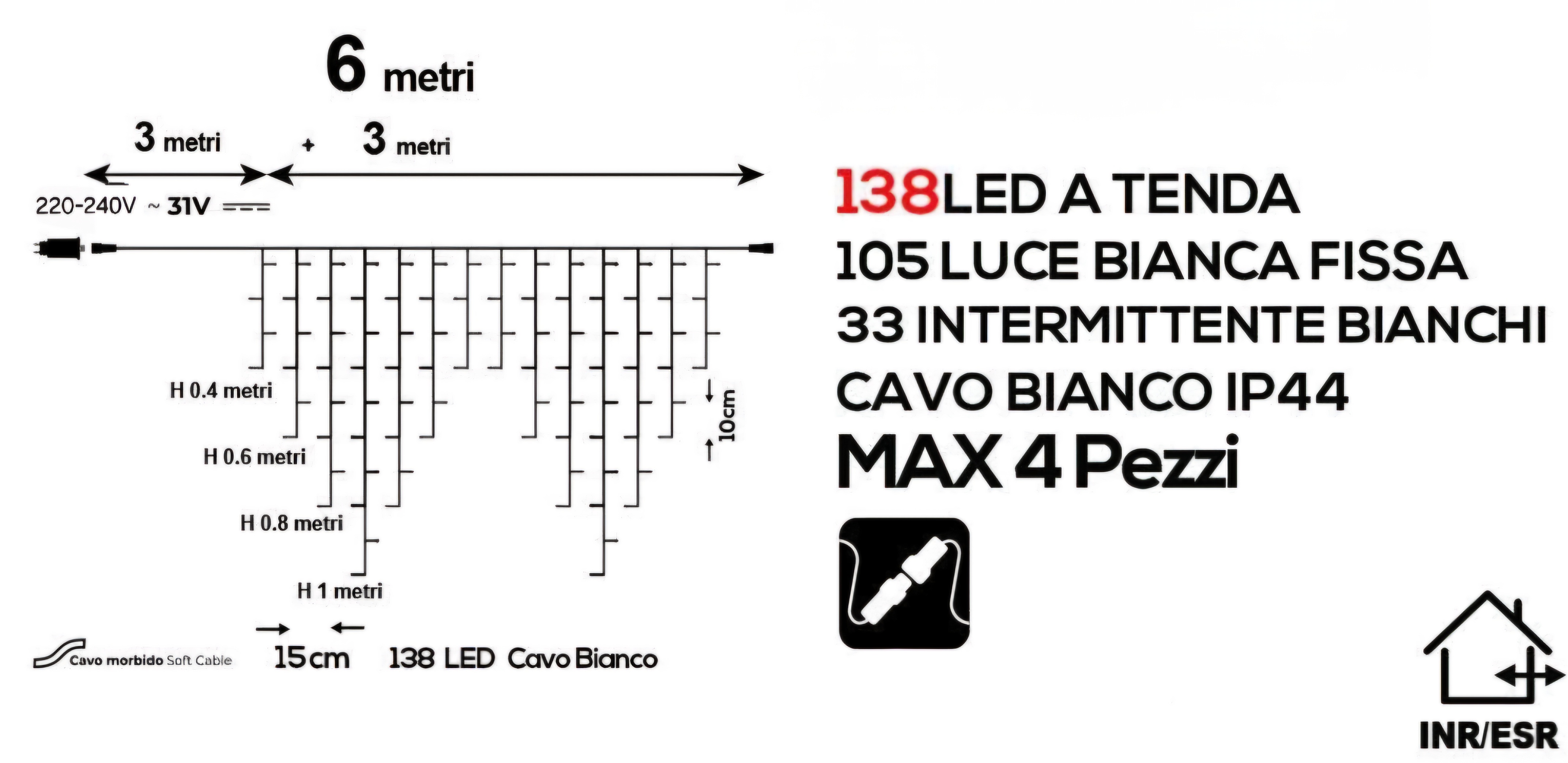 138 luci LED: Suddivise in 105 LED fissi bianco freddo e 33 LED flash a luce fredda per un effetto scintillante. Dimensioni: 3x1 metri di area illuminata + 3 metri di cavo di alimentazione per una facile installazione. Estensibile: Possibilità di collegare fino a 4 tende per un’illuminazione più ampia. Uso interno ed esterno: Grado di protezione IP44, ideale per decorazioni esterne durante le feste natalizie. Alimentatore incluso: Trasformatore a 31V incluso, da installare in un luogo coperto o in apposite casse di derivazione per esterni. Cavo bianco: Si integra perfettamente con qualsiasi tipo di decorazione, sia chiara che scura. Crea la perfetta atmosfera natalizia con questa tenda luminosa versatile e sicura, adatta per tutte le tue esigenze decorative.